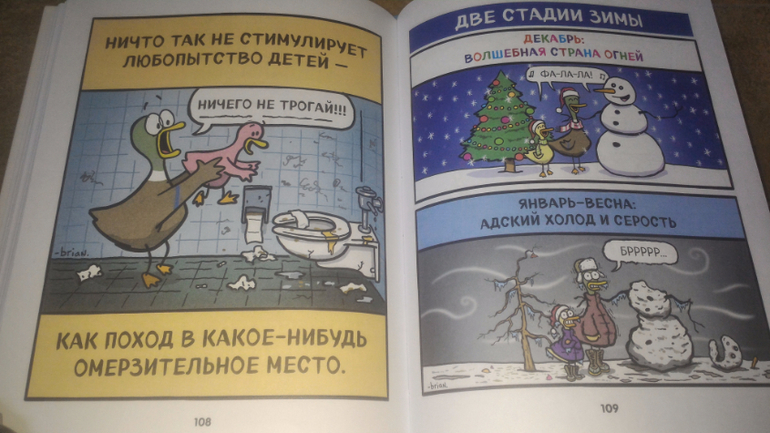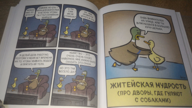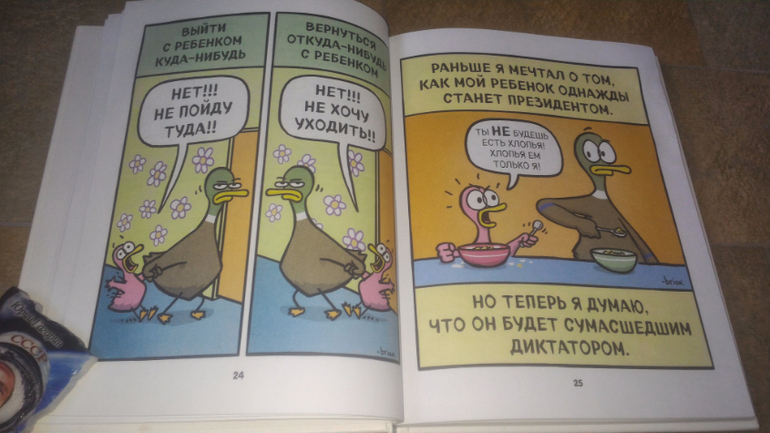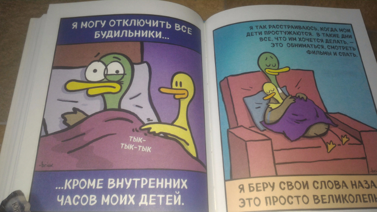 Вообще с этими веселыми картинками я познакомилась где-то полгода назад на просторах Интернета. А тут появилась целая книжка - ну как устоять?!) "Утиная семейка" очень веселая, заряд хорошего настроения гарантирован всем родителям) мы с мужем ухахатывались и вырывали ее друг у друга, а еще показывали на картинки и говорили: "О, смотри, как про наших написано".