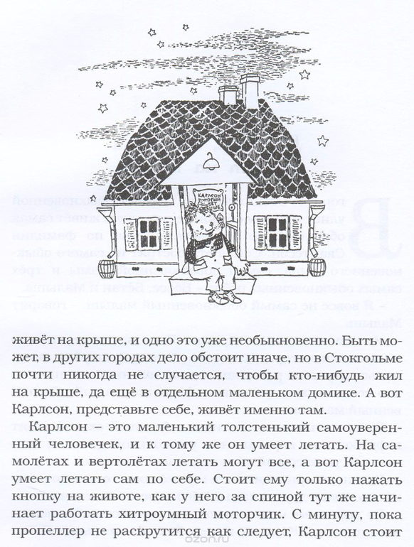 Книга замечательной шведской писательницы Астрид Линдгрен, лауреата многих престижных премий, в том числе золотой медали Андерсена, о Малыше и Карлсоне, который живёт на крыше.