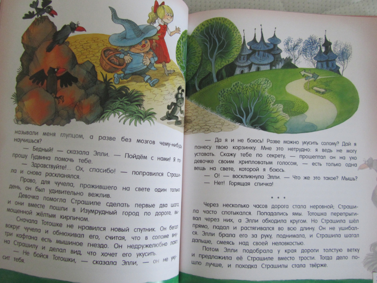 Александр Волков: Открой книгу! Волшебник Изумрудного городаЯ долго думала какое же издание купить, не смотря на то, что дома есть все части в одной толстенной книге без картинок подаренную мне когда-то в детстве мамой. Но первую часть, можно уже читать дошкольникам поэтому решила купить отдельно. Так вот чтобы не заворачиваться (простите уж за мой слэнг) с поиском ярких иллюстраций Владимирского, кто искал тоже как я, поймёт меня )) Я решила купить это издание с не менее чудесными иллюстрациями любимого Чижикова. И осталась вполне довольна, книга красивая, большого формата, страницы мелованные , отсюда рисунки очень яркие, хотя и не на каждой странице к сожалению. Читали книгу почти весь месяц, книга понравилась дочке, но не скажу, чтоб прям очень, поэтому показалось мне , что надо было лет в 6 )) В книге есть и жестокие моменты, например, про людоеда или про отрубленные головы летучих обезьян, я старалась при чтении немного текст в эти моменты менять, хотя дочь особо не акцентировала на них внимание. В целом книга и наше чтение удались, конец был счастливый - Элли вернулась домой ( а это дочку больше всего волновало), так что книгу рекомендую ;)).