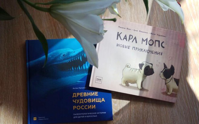 Потом день как в тумане: красота, поздравления, разговоры с близкими и обновки. А вечером уже в караоке меня настиг курьер - не смогла лишить себя возможности встретить утро с обновками-книжками. Сейчас дети из рук их вырывают. И это я думала, что от пресыщения книгами их уже ничем не удивишь: старший, только увидев обложку, схватил «Древние чудовища», а маленький (уж чего я совсем не ожидала, т.к. он вообще к книгам равнодушен) только увидел мопсика - тут такое началось! Карл Мопс какой-то магией обладает на людей - даже папа на него не ворчит.