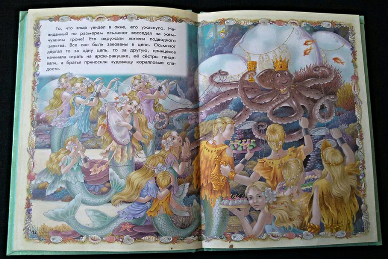 "Он храбро нырнул и стал спускаться сквозь темную воду, пока его ноги не коснулись дна. С каждой морской волной до Сэнди долетал тихий звон колокола, а вдали эльф начал смутно различать мерцающие огоньки. Сэнди подумал, что это, наверное, и есть подводный город, и зашагал на свет по песчаному дну".