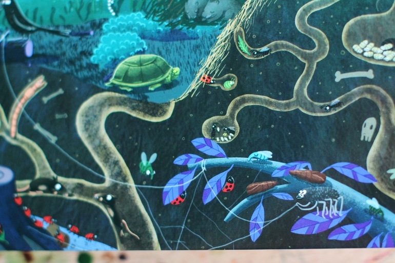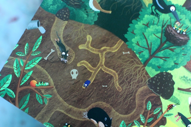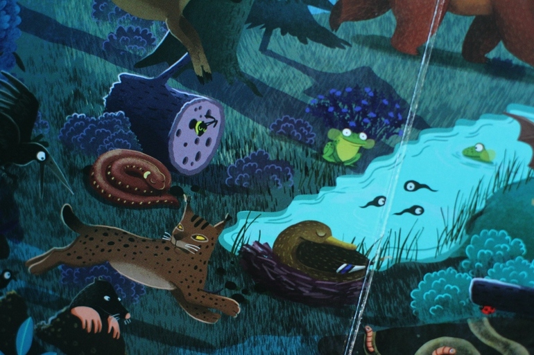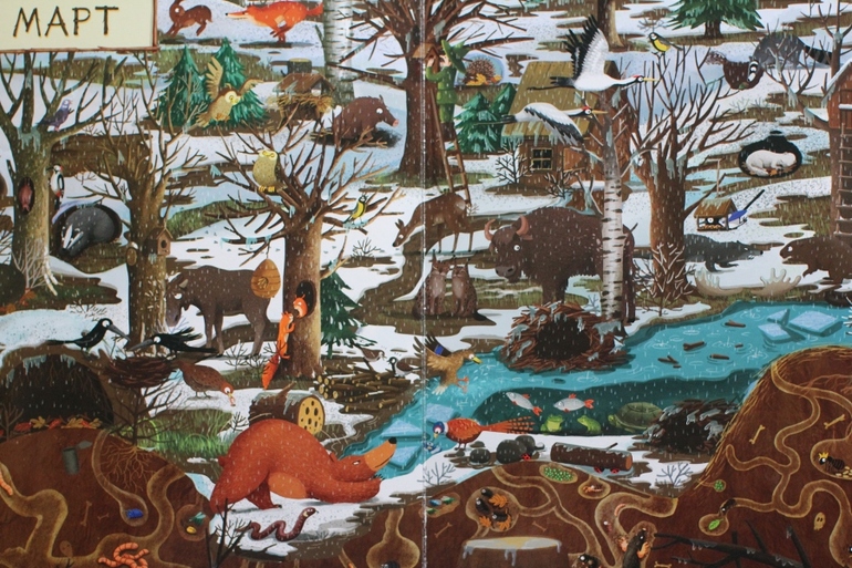 Одна - виммельбух, другая - энциклопедия. Одна нарисована в милом "мультяшном" стиле, в другой - шикарные реалистичные пейзажи. Но в каждой есть двенадцать разворотов с одним и тем же местом в разные месяцы года. Ну, знаете, как "Городок", только про лес :) Очень наглядно - как и что изменяется в природе.