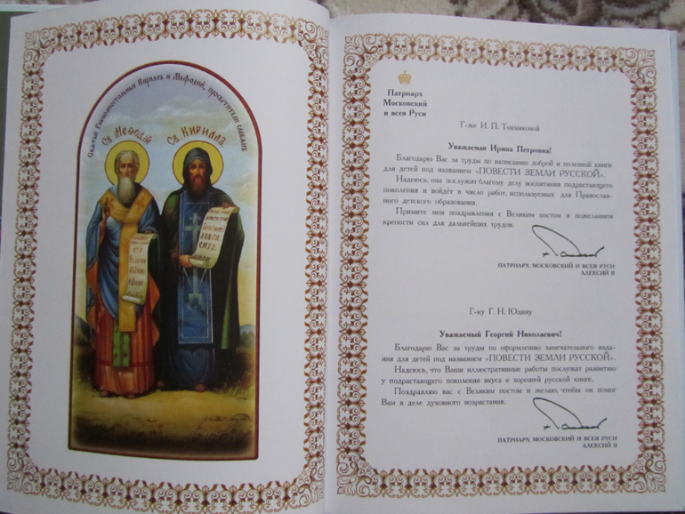 Давно это книга лежала в отложенных, но всё же пока она не пропала из продажи, я решилась на её покупку. А книга хорошая, нужная, правда очень православная ( может для кого-то это важно), одобренная к печати русской православной церковью. Текст Токмаковой мне лично понравился, хороший пересказ летописей и древних русских исторических повестей понятный любому школьнику, даже я не все факты приведённые в книге знала. Например, я не знала, что у нас на Руси есть такой город -призрак, Большой Китеж, скрытый от взора людей для его сохранения, самим Господом( произошло это при набеге Батыя ) и появляется только перед истинно верующими благочестивыми людьми! Иллюстрации Юдина порадовали, хотя не во всех книгах он мне нравится, многие рисунки прям похожи на иконы. В общем отличная книга для детей проявляющих интерес к собственной истории.