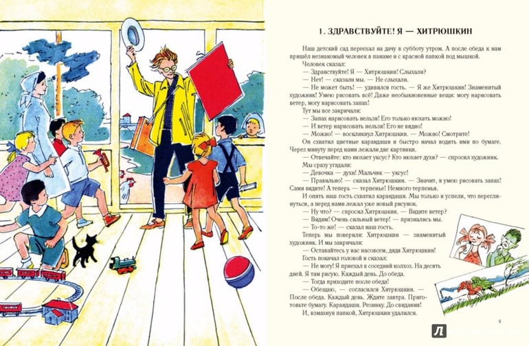 Однажды в детский сад пришёл человек в панаме и с красной папкой под мышкой. Как, вы не знаете, кто это? Это же знаменитый художник Хитрюшкин, который умеет рисовать всё на свете, даже ветер и запах! Что с ним только не приключалось! Он побывал в джунглях Африки, пустыне, сибирской тайге, плавал в Северном Ледовитом океане.