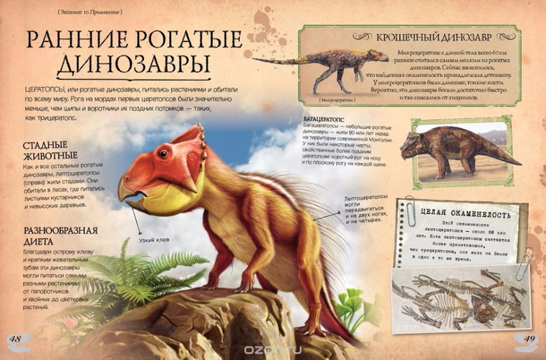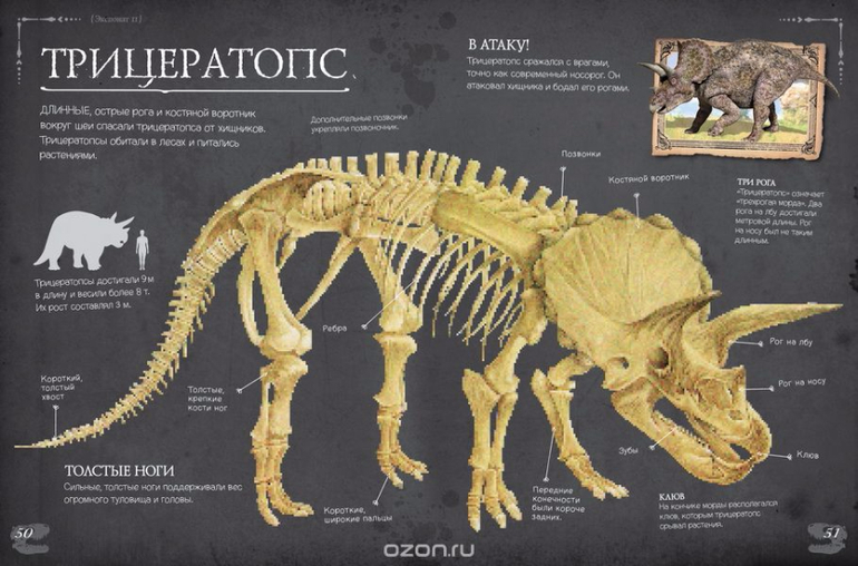 - Из каждого разворота можно узнать: строение динозавров (названия и расположение костей), места обитания, размер животного, повадки и множество других интересных фактов!