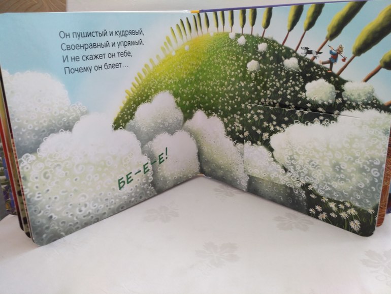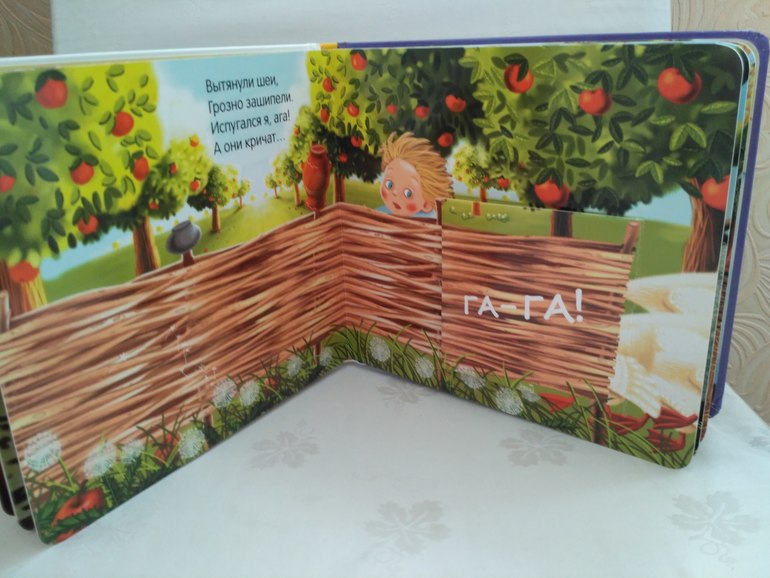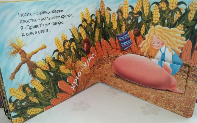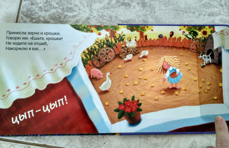Мне нравится что книгу можно обыгрывать по разному. Можно читать текст и двигать элементы. Можно изучать животных, находить их на картинке, проговаривать кто как говорит. Курочки ко-ко, цыплята пи-пи, свинки хрю-хрю..