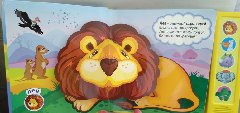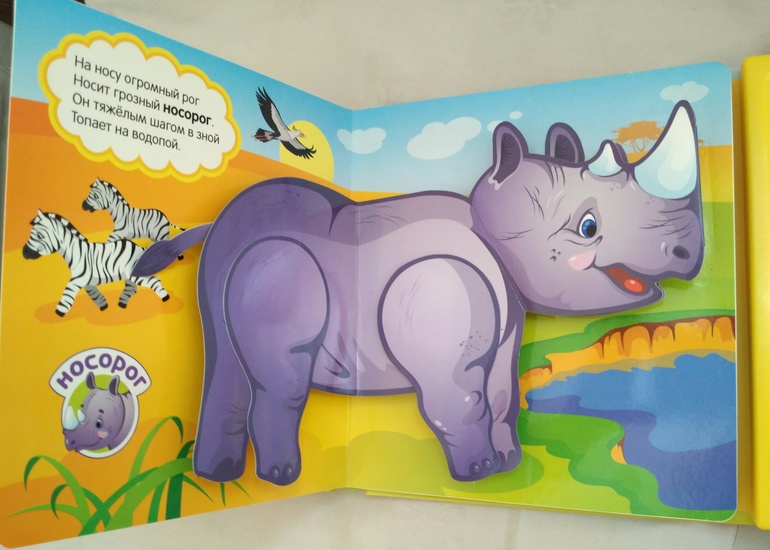 - объёмные животные. Это и правда интересно и необычно. Причём если немного двигать страницы, животное тоже двигается, и кажется что лев то открывает то закрывает пасть, а носорог шагает..