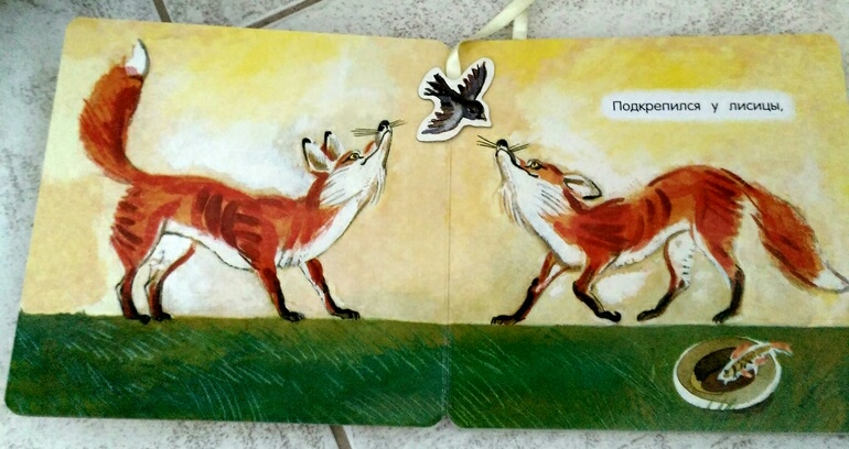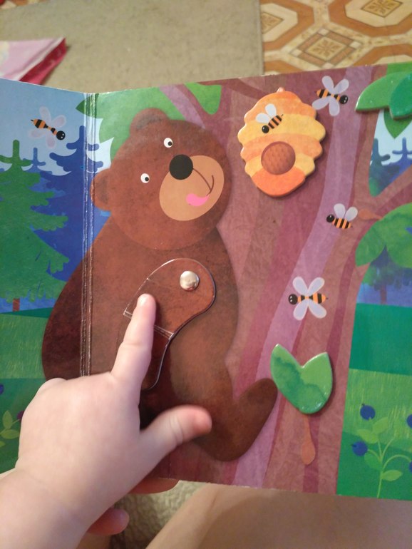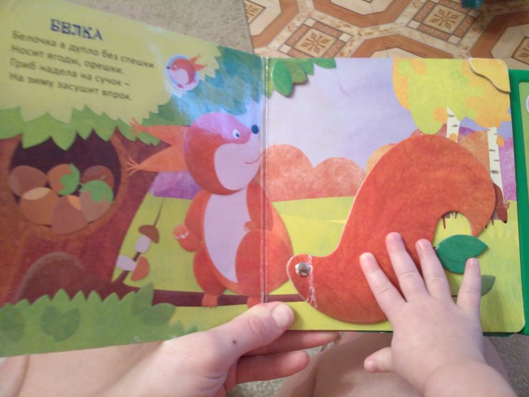 Фишка книги в подвижных элементах. У медведя двигается лапа, у белки хвост, у волка морда, у зайца ухо. Когда читаю Даше нравится что они двигаются, ей конечно тоже очень хочется, их продвигать, учу как это делать правильно, но все равно все элементы уже изрядно помяты))