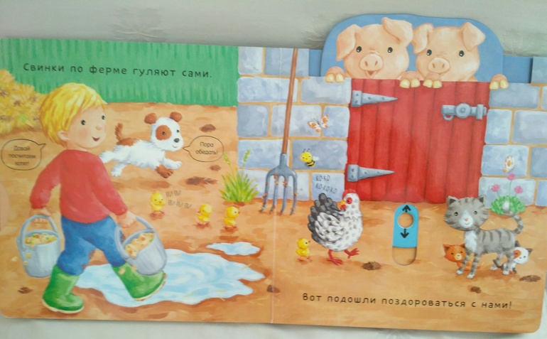 Очень и очень интересная книга для малышей, ведь здесь все двигается, и самое главное что и годовалый ребёнок справляется - сам открывает-закрывает, поворачивает.. Поросята поднимаются, дверь в амбар с коровами отодвигается,.. И малыш участвует в процессе!! Наблюдает как меняется картинка, удивляется и пробует снова и снова!!