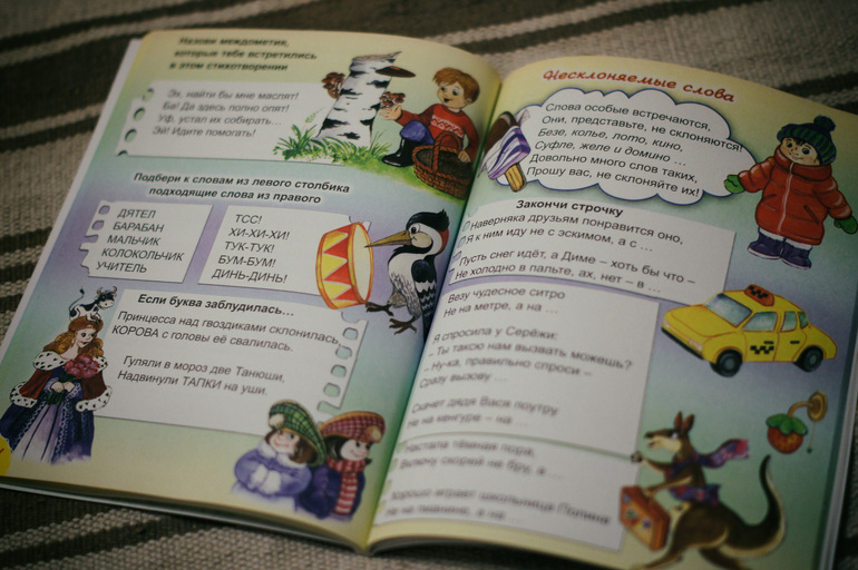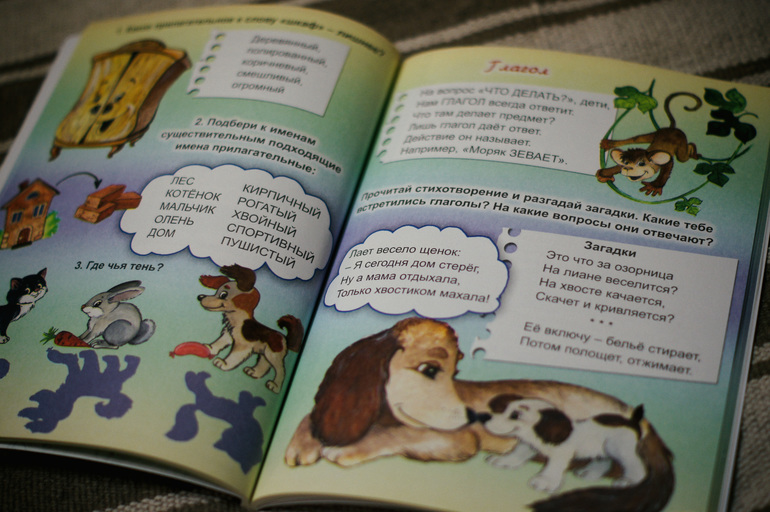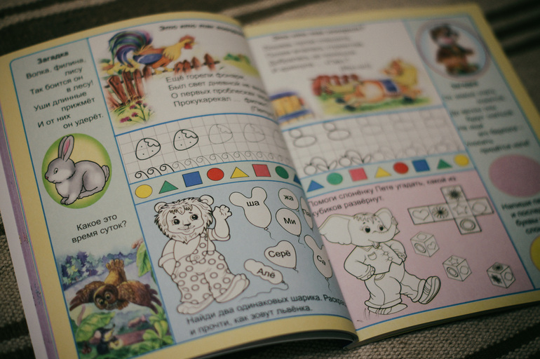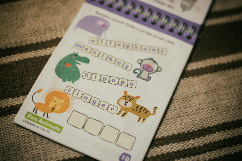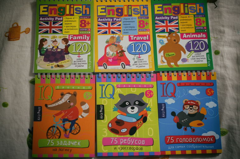 В английском языке задания разнообразные. Каждый блокнот имеет свою тематику. Семья, животные, вещи и есть еще что-то, но в нашем магазине было только 3.