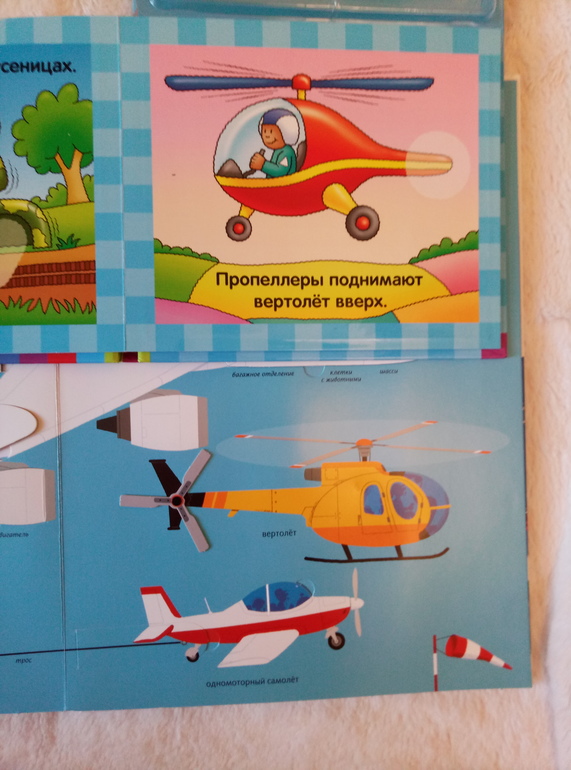 В книжке нарисовано 12 видов транспорта, простые яркие картинки, текст буквально по одному предложению про каждый вид транспорта. Самое интересное, что у каждого транспорта не хватает какой то части, у некоторых даже двух, и есть 15 магнитов-частей, которые и надо прикрепить строго в определенное место.