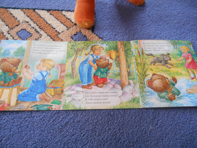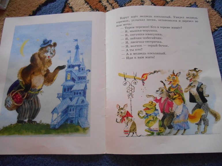 Оочень мы его любим! Особенно тот разворот, где появляется медведь. До этого можем исступленно листать, краем уха слушая маму, но как только появляется медведь, доча вся - внимание!!!))) Рекомендую! Долго выбирала, именно эта книга соответствует всем моим требованиям: и иллюстрации (животные появляются именно на той странице, на которой про них упоминается и они действительно интересно нарисованы!) и текст (мне важно было найти "Теремок" с текстом, где звери в конце построили новый теремок)