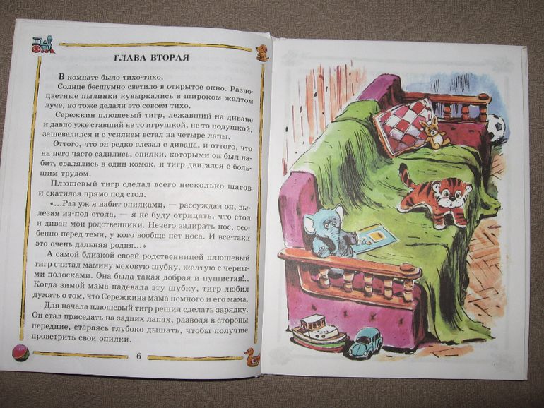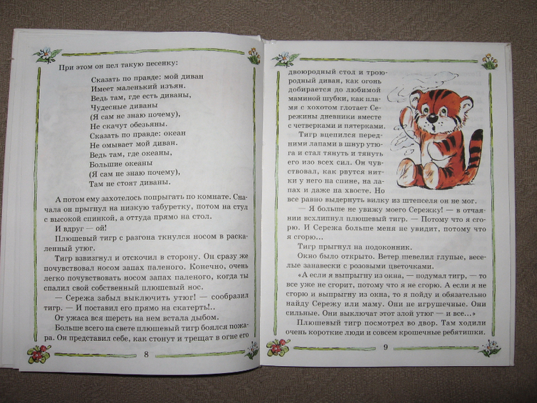«А если я выпрыгну из окна, - подумал тигр, - то всё уже не сгорит, потому что я не сгорю. А если я не сгорю и выпрыгну из окна, то я пойду и обязательно найду Серёжу или маму. Они не игрушечные. Они сильные. Они выключат этот злой утюг - и всё…»