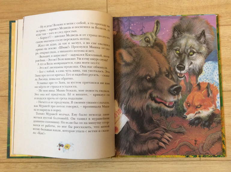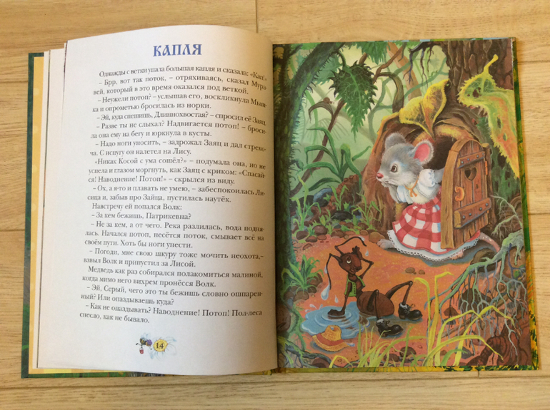 В гоавных рроях лесные и домашние звери. Везде обыгрываются достаточно жизненные ситуации, то, что мы так часто объясняем своим деткам. Что попусту не надо спорить, надо делом доказывать и не тот умен, кто громче кричит, а тот кто дело хорошо делает. Или вот сказа про каплю о том, как капля упала на муравья и он сказал: "брр, вот так поток", мышка это услышала и давай панику разволить, в итоге все лесные звери начали думать, что надвигается потом и все сносит. Ну и конечно сказка есть про то, что звери к зиме шубку свою меняют, про то, что если всех высмеивать, то можно одному остаться, и про то, что прежде чем говорить, думать надо.