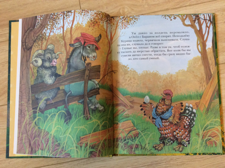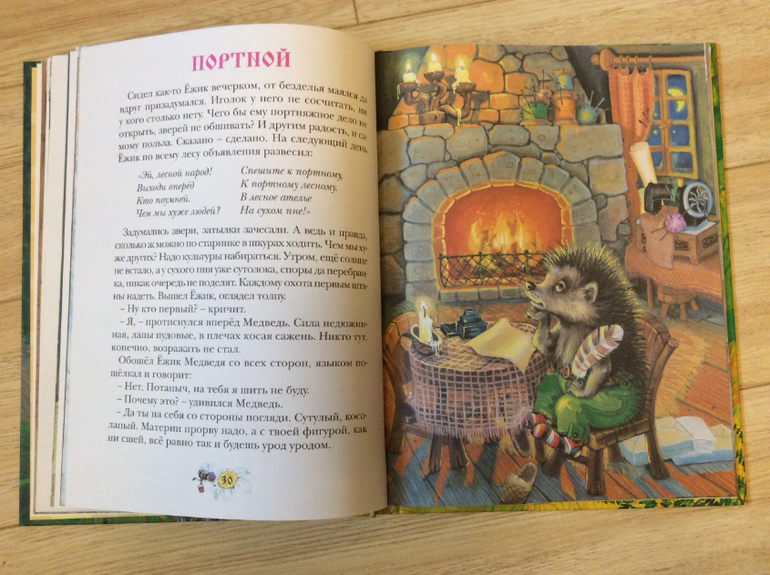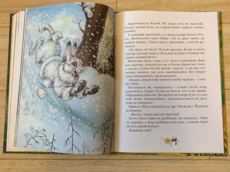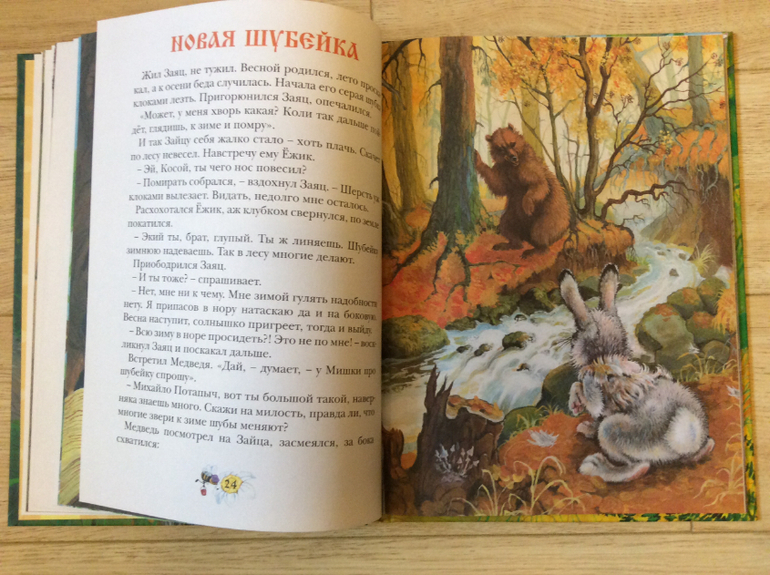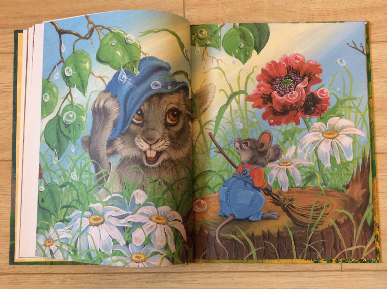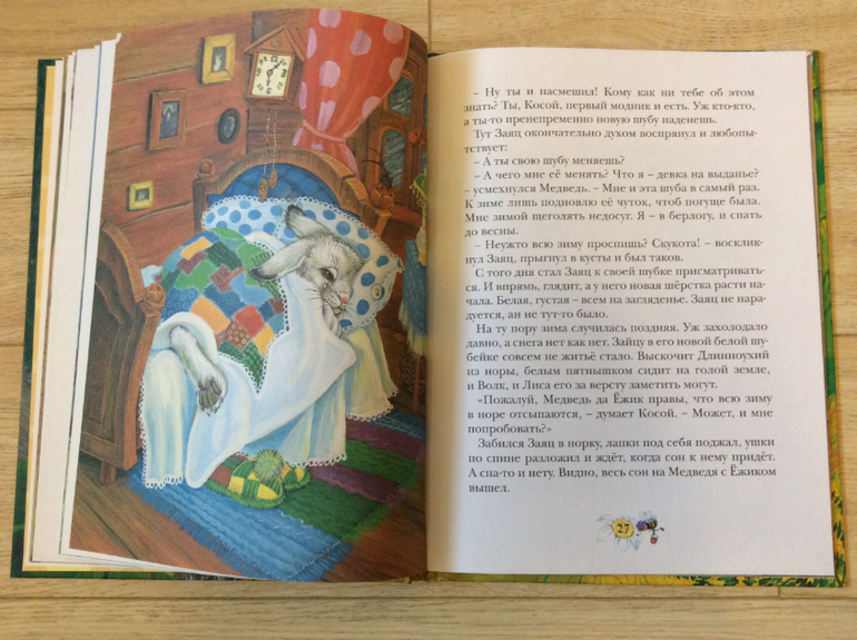 Иллюстрации чудесные, хотя мне больше нравится, когда звери без одежды. Картинки крупные и есть что порассматривать и на что внимание обратить, зверье красивое :) есть иллюстрации на весь разворот. Грустный зайка в кровати под одеялом необыкновенно мил! Так и хочется нго обнять.