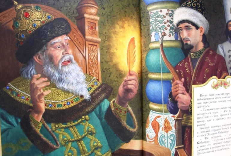 Руф Сандерсон ведет свой рассказ очень гуманно. У нее герой не скачет на маленьком коньке, а везет его крепкая кобылица, нет и жуткого примера братской «любви», нет зависти придворных, герой не хватает Царь-девицу, а приглашает во дворец. И самое главное! Меня всегда коробило читать ребенку, как царь сварился в кипятке, здесь же он не сварился, а тоже преобразился и очень неожиданно. Заканчивается сказка настоящим всеобщим счастьем.