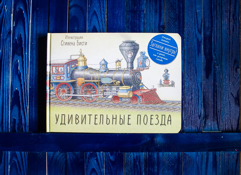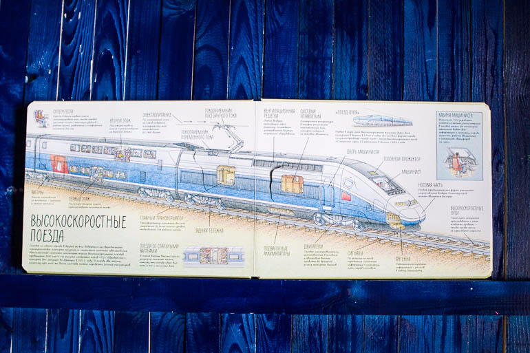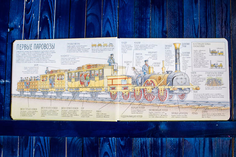 Есть вы с серией «Интерактивные книги Стивена Бисти» еще не знакомы, то будьте готовы к потоку информации, который обрушится на вас с первой страницы. Кто изобрел первый паровоз? По рельсам какой страны простучали его колеса? Что такое «купол удовольствия», и зачем он был нужен? Зачем поезду двигатель в 3000 лошадиных сил? Что общего у самолета и поезда будущего? Обилие интересных фактов и просто ценных сведений для любителей техники делает книгу ценной как для трехлетних малышей, так и для школьников. От себя могу добавиться, что мой 14-ти летний студент завис над этой книгой надолго…