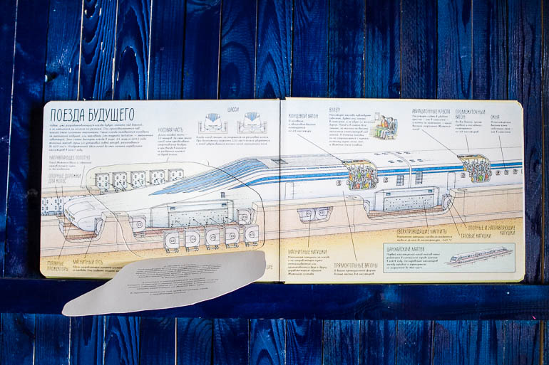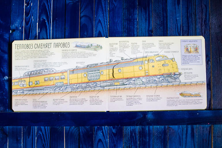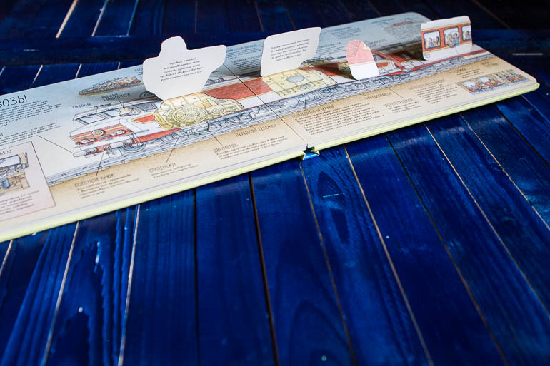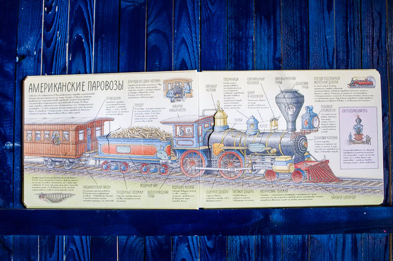 Восемь картонных разворотов, на которых крупные рисунки поезда сопровождаются богатыми текстовыми и графическими пояснениями, ведут нас сквозь время от начала 19 века и в недалекое будущее.
