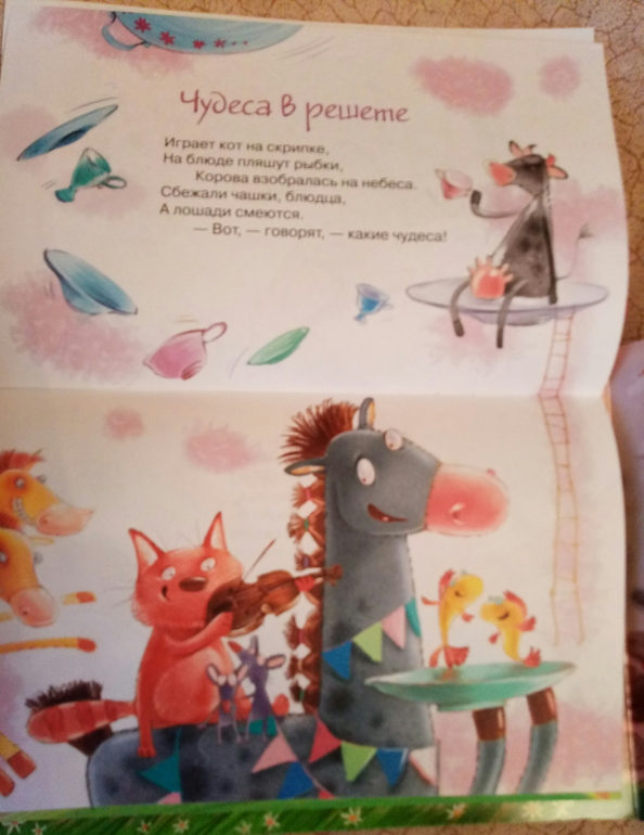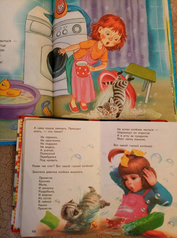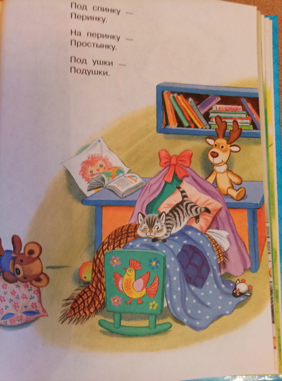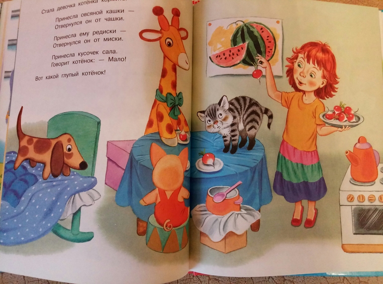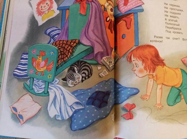 И что для меня было самым важным, что здесь прорисованы все основные действия по ходу стихотворения, это именно то, что я очень хотела. Особенно мне не хватала такой детализации в Усатом Полосатом.. я давно смотрела на издание от Мелик- Пашаева с рисунками Лебедева, но вот рисунки никак не совпадали с моим восприятием, хотелось более яркого, динамичного, все таки стихотворение такое озорное. В этом сборнике именно такие рисунки, как я себе представляла) и очень мне нравится, что все перемещения котенка в кровати здесь показаны)