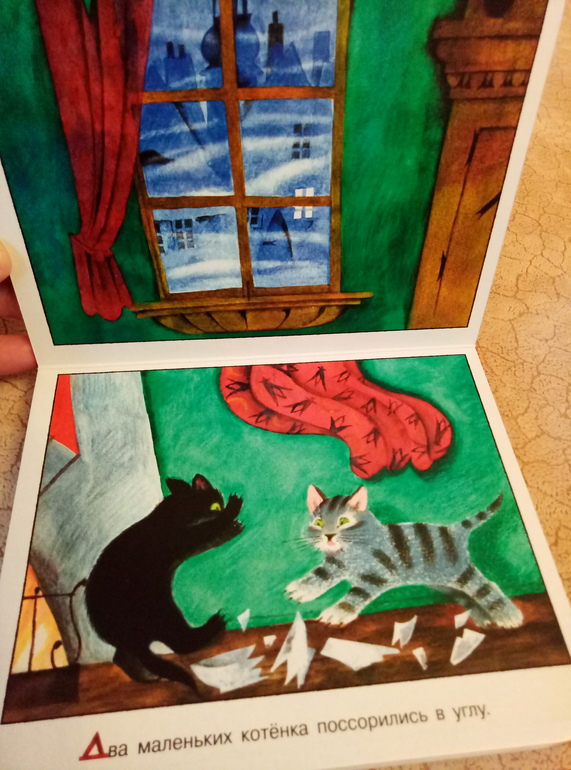 В картонке три английские народные песенки в переводе С.Маршака. Первая Котята, которых хозяйка за хулиганство выгоняет на улицу. Ох, как же в детстве мне было обидно, когда родители не разбирая, кто виноват, наказывали и меня и брата.. и как потом мне стало это понятно, когда был период дочка моя с племянницей постоянно отношения выясняли) я сначала честно пыталась выяснить кто прав, кто виноват, но потом сдалась, и обеих на(мороз) в другую комнату отправляла)