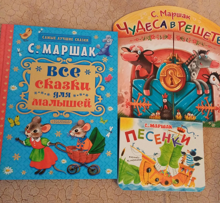 Из этих в свое время был зачитан Полосатый,Карман и Вакса,отдельные Детки в клетке и Глупый мышонок и сборник с коровой от Бордюг,Трепенок -сейчас читаются с Ясей.И мне очень симпатичен этот дуэт художников в Маршаке!!!