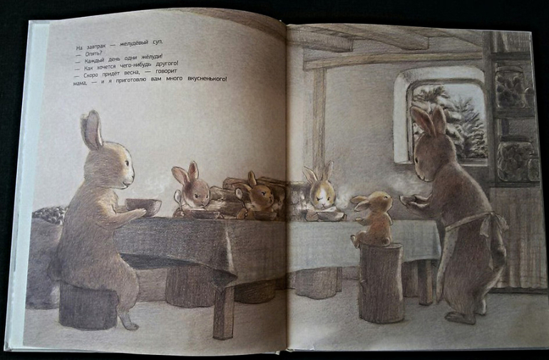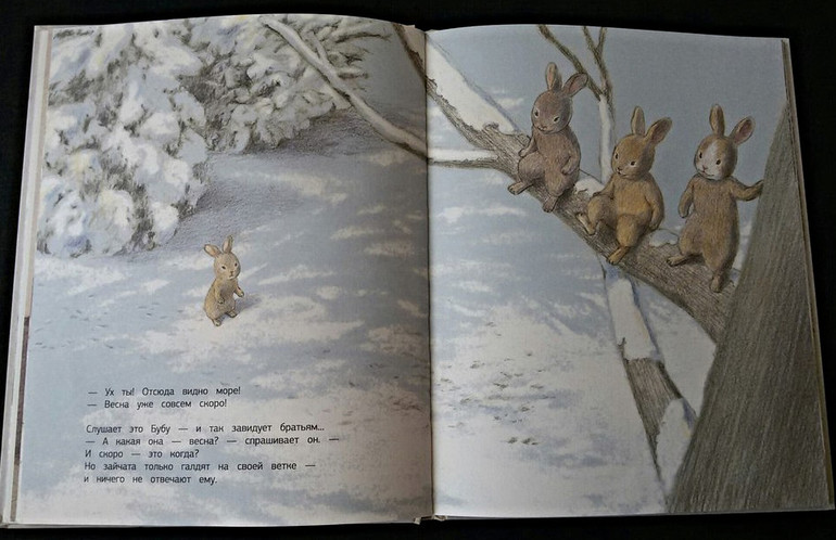 "Лес тихонько ждет прихода весны. А глубоко в его чаще живет одна заячья семья. И самый младший из зайчишек, Бубу, еще не знает, что такое весна".