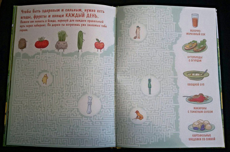 Теперь вся эта информация используется в дочкиных рассказах. Но больше всего ей понравился последний разворот с большим лабиринтом. Даже пройдя его много раз, она все равно подолгу над ним зависает и чтение книги у нее начинается именно с него, и идет в обратном направлении.