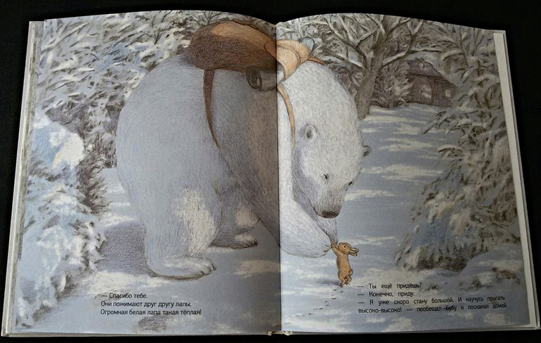 "От восторга Бубу чуть не падает с ветки, но огромная лапа бережно держит его. Снег возле моря совсем растаял, и вдоль берега тянутся поля зеленой травы. - Я знаю, - говорит Бубу. - Все становится зеленым, когда приходит весна... А солнышко все ласкает щеки Бубу - и согревает его".