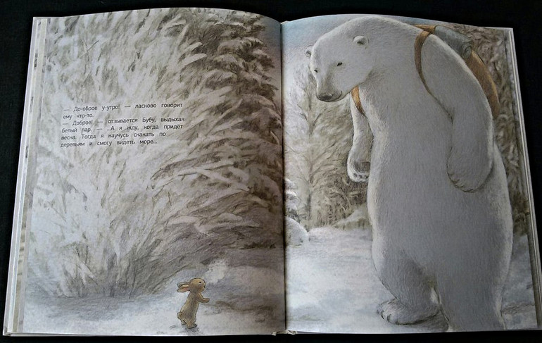 Маленького зайчонку очень любопытно: какая она весна и когда она придет. Однажды на рассвете, когда все еще спят, Бубу слышит странные звуки. Он выходит посмотреть, что же это и сталкивается с огромным белым медведем. Новый друг сажает зайчонка на ветку огромного дерева. Первый раз в жизни Бубу увидел, где кончается лес и начинается море.