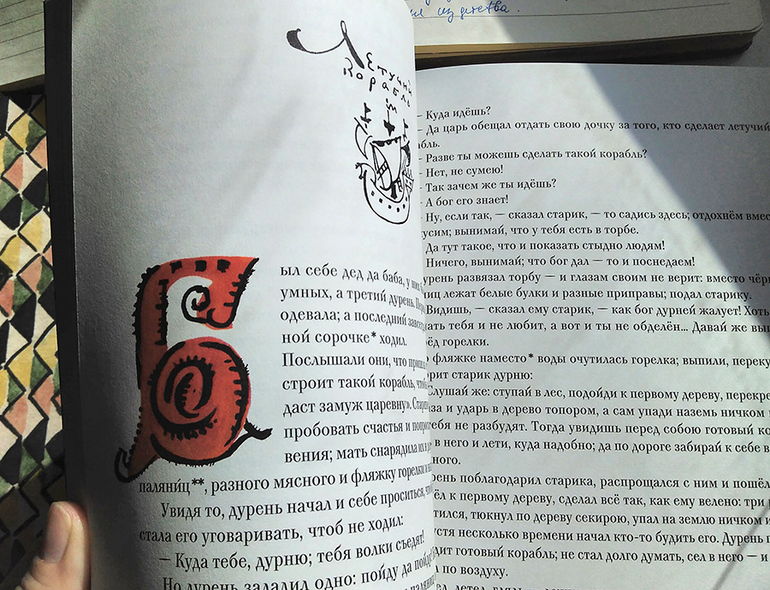 Но я отвлеклась. Шрифт подобран прекрасно. Гарнитура т.е., как у нас в тридевятом государстве говорят. Размер средний, с буквой «ё», убористый, но зато по всем канонам типографики с засечками! Его очень удобно читать. Сказочную гарнитуру Kuzanyan вижу редко, ну очень приятная, а эти хвостики у букв, и даже хвостик у «й» какой ладный! Вы сомневаетесь, что она сказочная? А буквицы то какие! Вы только вглядитесь!!