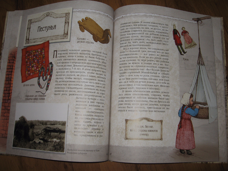 Чтение книги подтолкнуло к посещению краеведческого музея, которое все откладывалось и откладывалось. Там частично сохранены и одежда, и предметы быта, и предметы труда, пусть и не все-все-все. Кроме того, у нас сохранилось от бабушек-прабабушек некоторые вещи, например, старая ступка, жутко тяжеленная, прялки и веретена, утюг, который должен наполняться углями. Этого может и маловато, но хоть какое-то представление о той жизни у детей должно сформироваться.