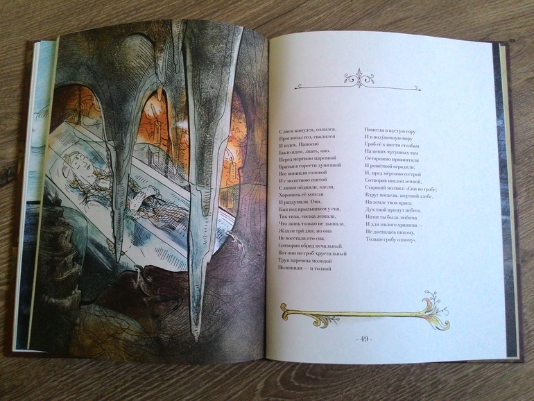 В целом, приобретением я довольна. Бумага - плотный офсет, кремового цвета. Блок прошит. Оформление продуманное от переплета ( напомнил он нигмовскую "Калевалу" имитацией "под дерево")