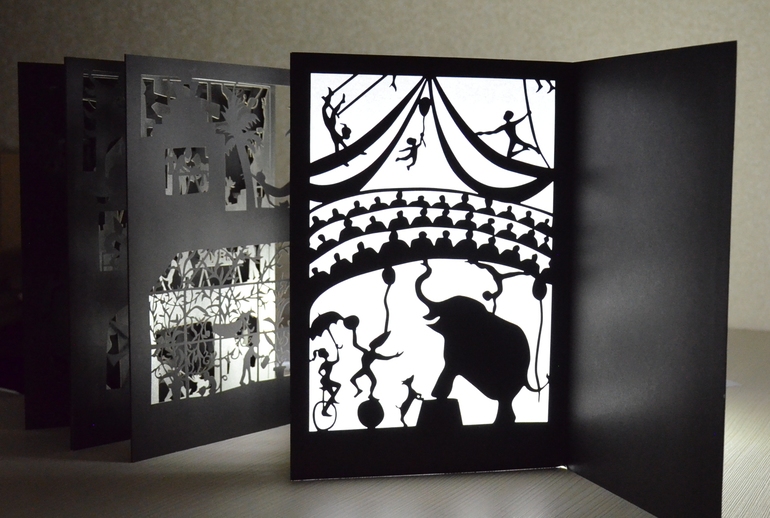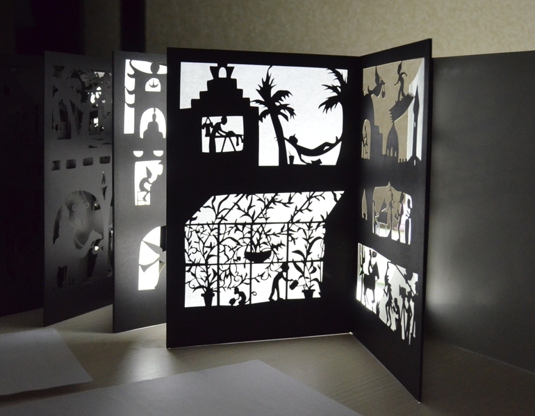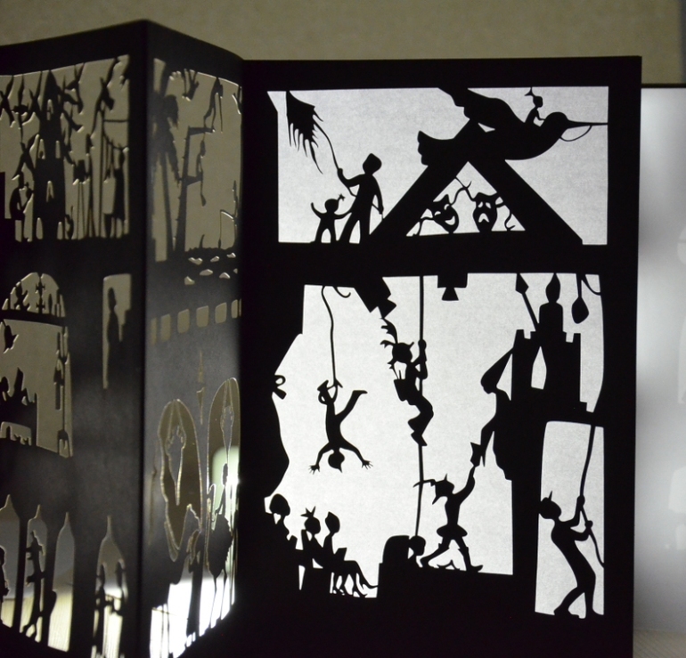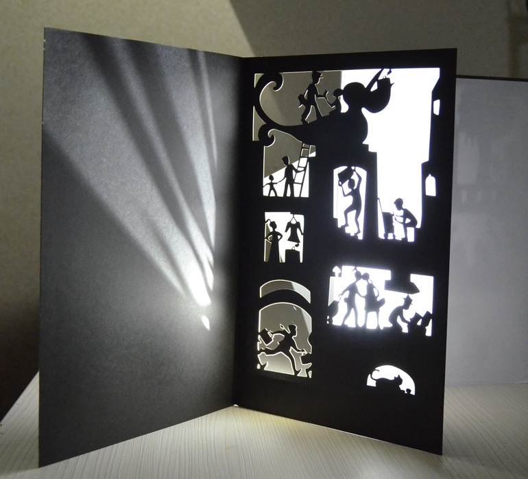 Это книга-картинка, но не обычная, как мы с вами привыкли видеть. Она живая. Иллюстрации в ней - вырезанные из чёрной бумаги силуэты людей и животных, лестниц, крыш и домов. Полностью развернув книгу, мы видим, что очутились ночью на улице одного города, но этот город очень необычный, и улица, по которой мы путешествуем, тому подтверждение. Давайте вместе отправимся на прогулку по этой улице!
