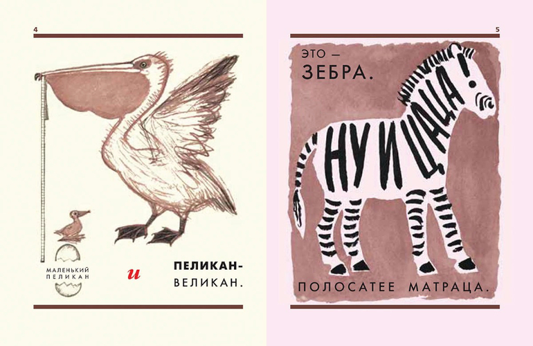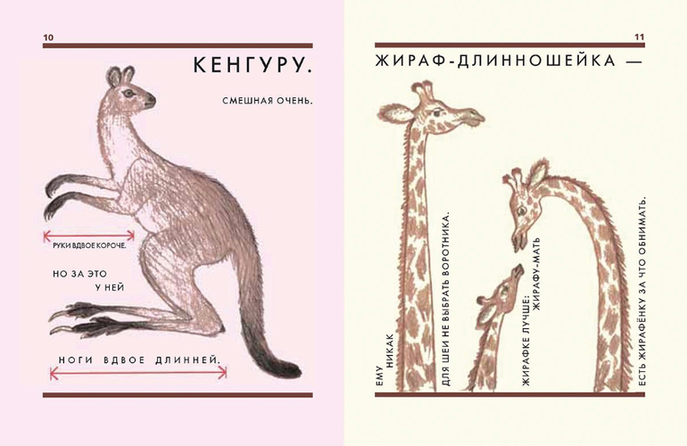 С детства знакомые всем родителям строки Владимира Маяковского идеально подходят для первого знакомства ребёнка с экзотическими животными и их детёнышами. Вот лама дочь и лама мама, а вот маленький пеликан и пеликан-великан. А здесь - малютка слонёнок «ростом с папу нашего». А у кенгуру передние лапы гораздо короче задних. А у жирафа - такая длинная шея что ему «никак для шеи не выбрать воротника».