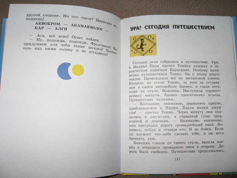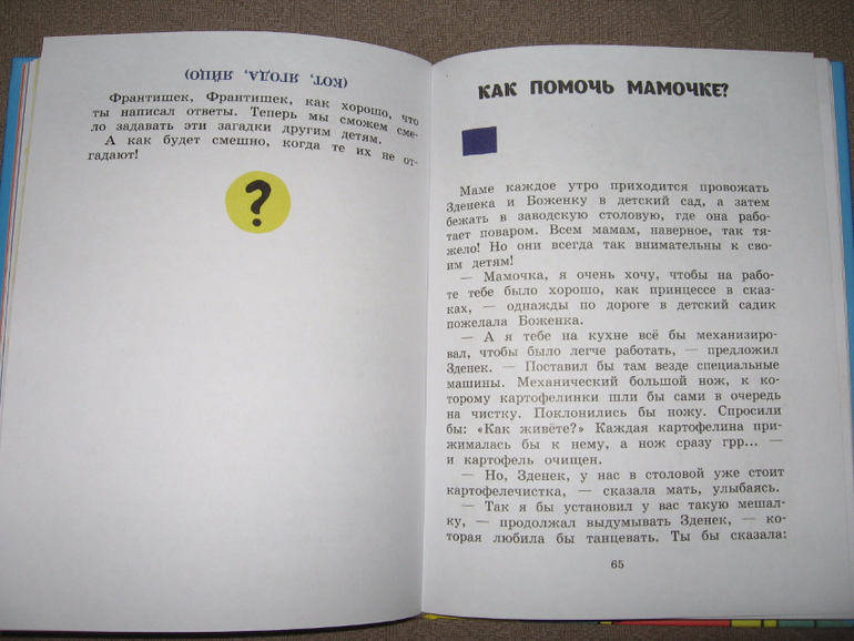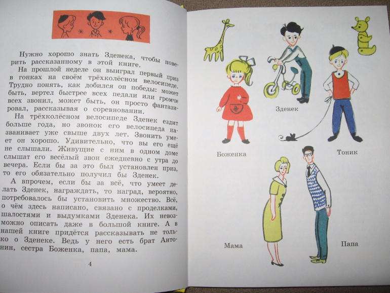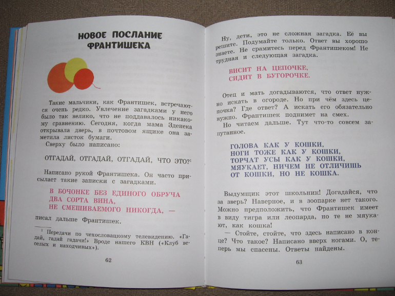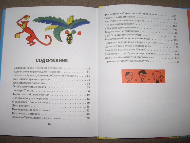 Кроме того, в гости к детям (Тонику, Зденеку, Боженке), а также к маме с папой, частенько заглядывает Франтишек. Этот мальчик уже учится в школе, он очень любознательный и немного хвастливый, он коллекционирует спичечные наклейки и любит загадывать загадки. Вот этот школьник периодически появляется со своими загадками на страницах книги. Ответы на них даны сразу же в конце главы, но их не обязательно тут же читать, можно попытаться и самим дать ответ.