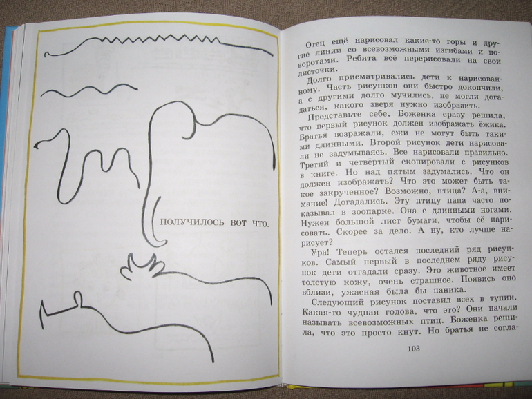 Еще в книге есть неплохая идея с незаконченными рисунками, которые обязательно нужно дорисовать. А что бы это правильно сделать, по имеющимся линиям нужно отгадать, что имел ввиду художник. В книге есть рисунок с этими линиями, а у нас дома есть копир, поэтому не только герои книги пытались выполнить это задание. Ниже на разворотах можно посмотреть и рисунки, и загадки.