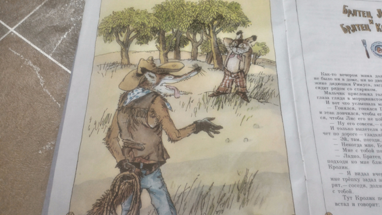 Дж.Харрис "Братец Лис и Братец Кролик". Я помню, как мне ее читал дедушка, укладывая спать. Теперь другого Кролика и Лиса для меня не существует, только вот эти, нарисованные Казбековым.