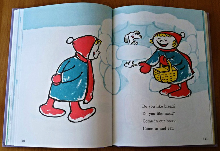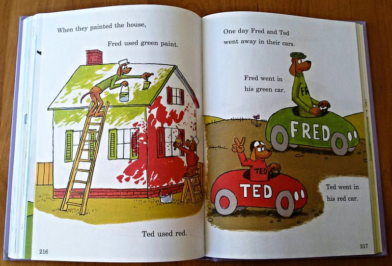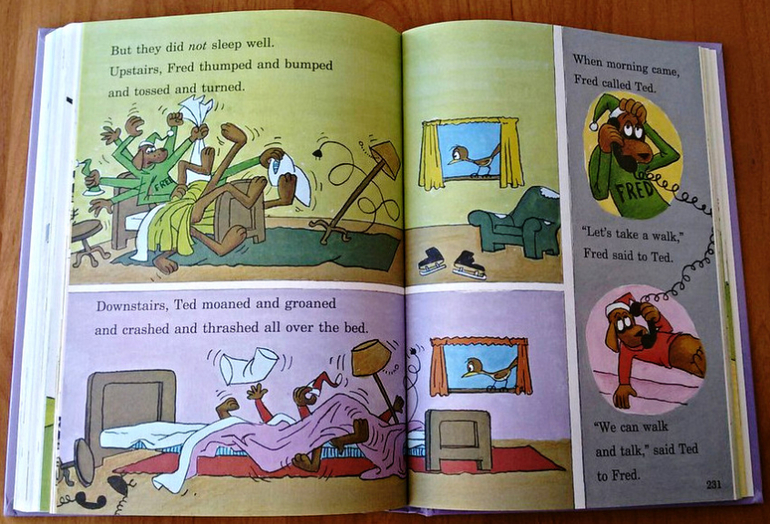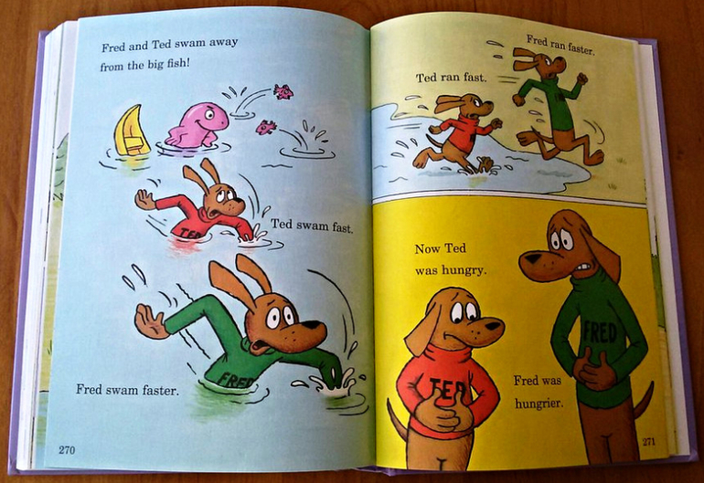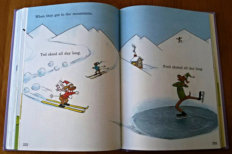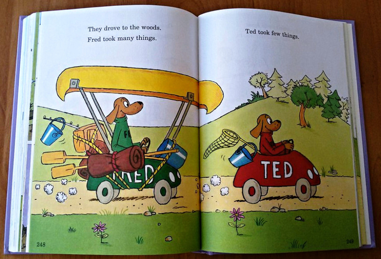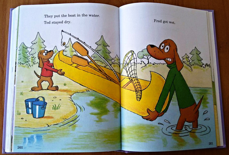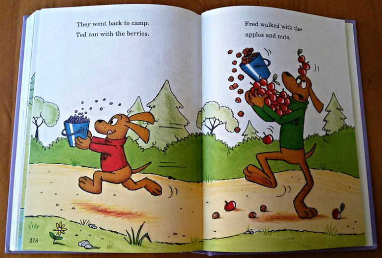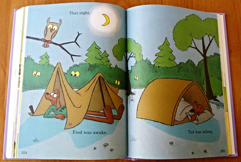 В истории "Fred and Ted Go Camping" by Peter Eastman очаровательные собачки отправляются на отдых. Они загружают в свои машины все необходимое, ночуют в палатках и рыбачат на озере. Но их лодка переворачивается, вся пойманная рыба уплывает и они остаются без обеда. Весь рассказ построен на коротких фразах.