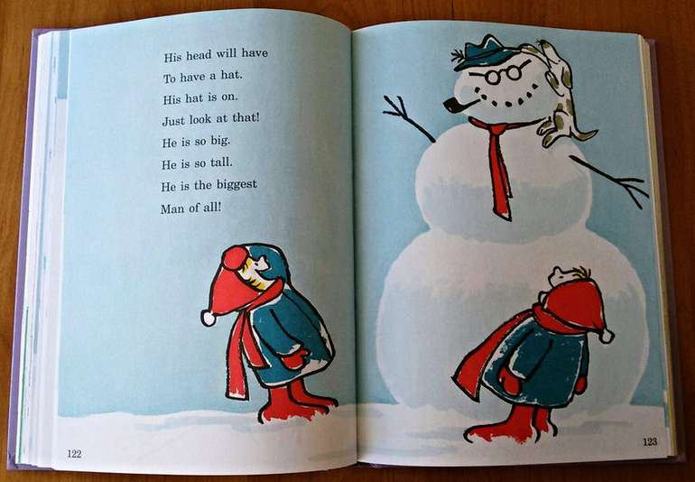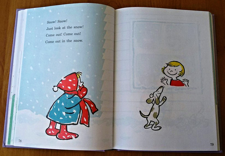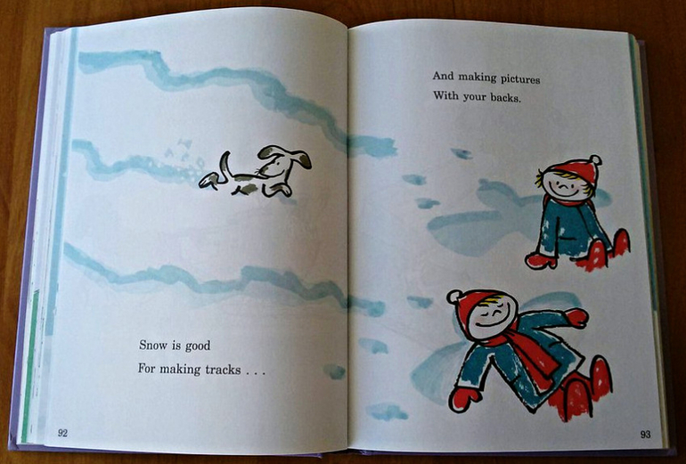 "Snow" by P. D. Eastman and Roy McKie - простой рифмованный текст с картинками почти к каждой строчке. Представлен весь спектр забав в снегу. Описаны, мне кажется, все виды зимних развлечений: снежки, санки, снежные ангелы, снежные крепости, лыжи, снеговики и т.д. Отличная история для зимнего чтения.