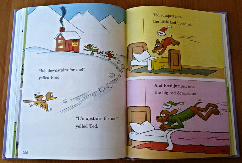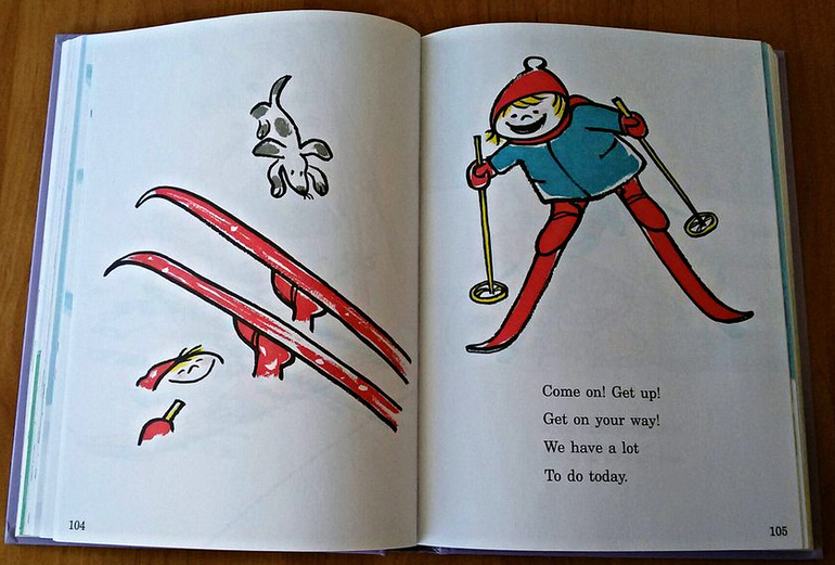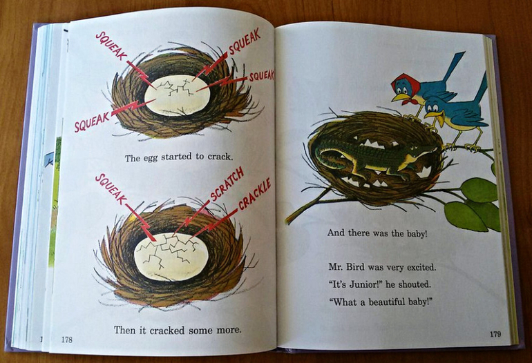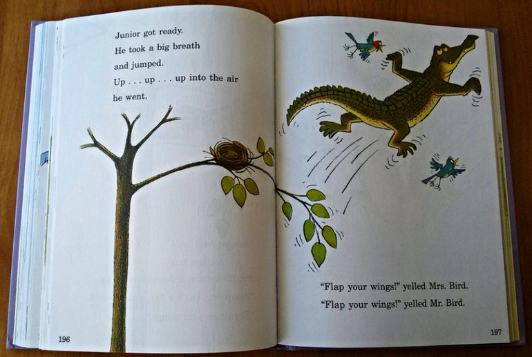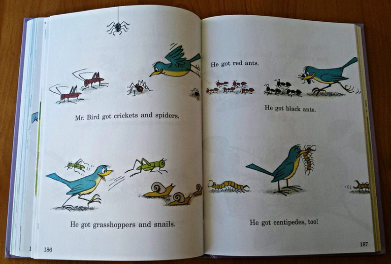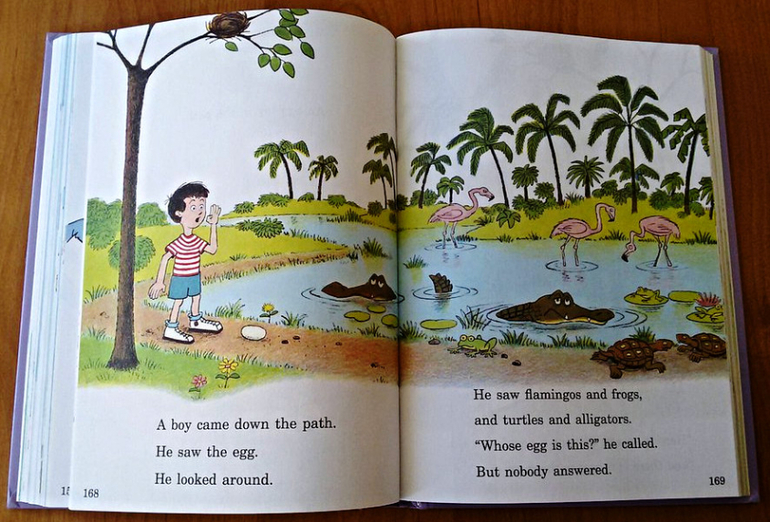 "Flap your wings" by P. D. Eastman забавнейшая история, по которой можно изучать животных и насекомых. На дороге мальчик нашел яйцо, осмотревшись вокруг, он увидел на дереве пустое гнездо. Решив, что именно оттуда выпало яйцо, он положил его обратно.