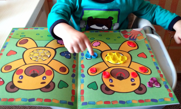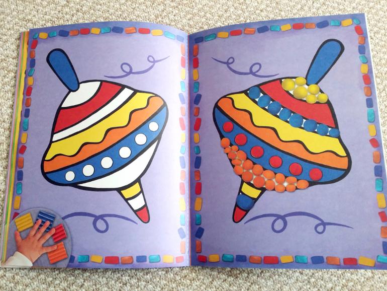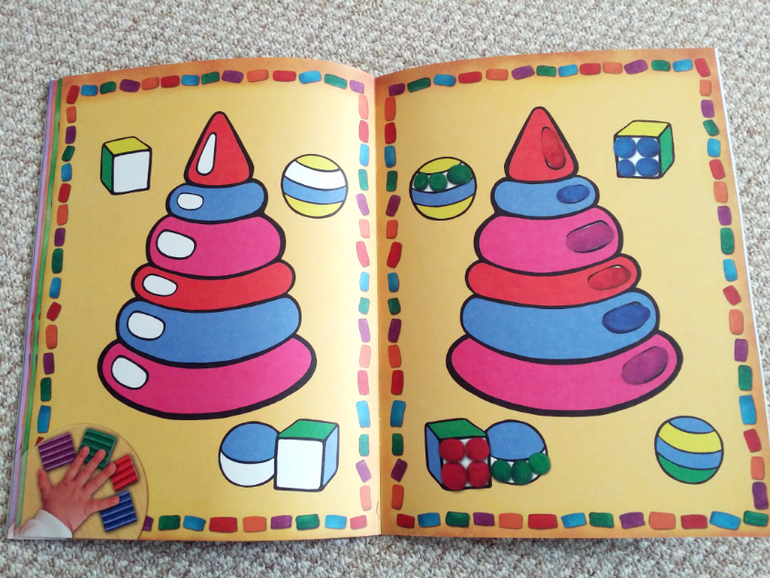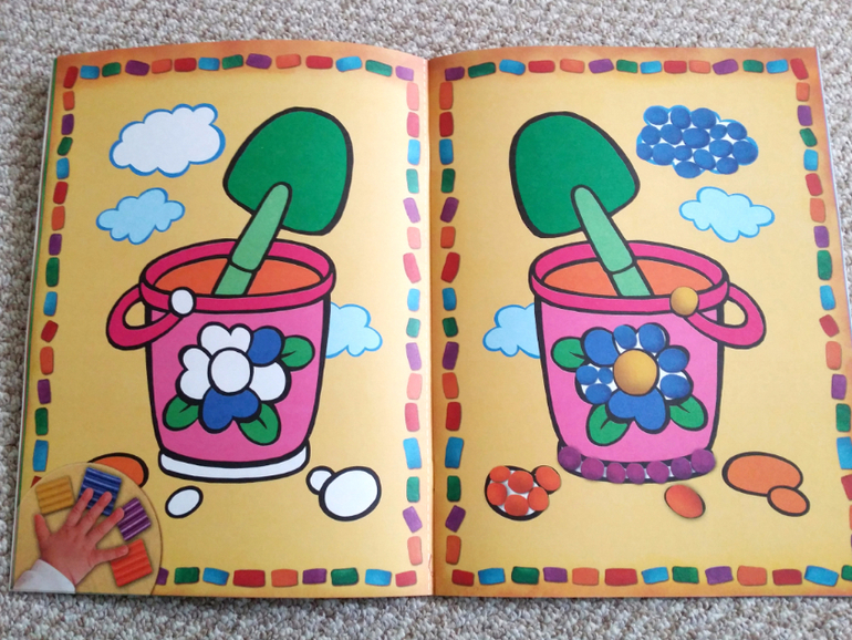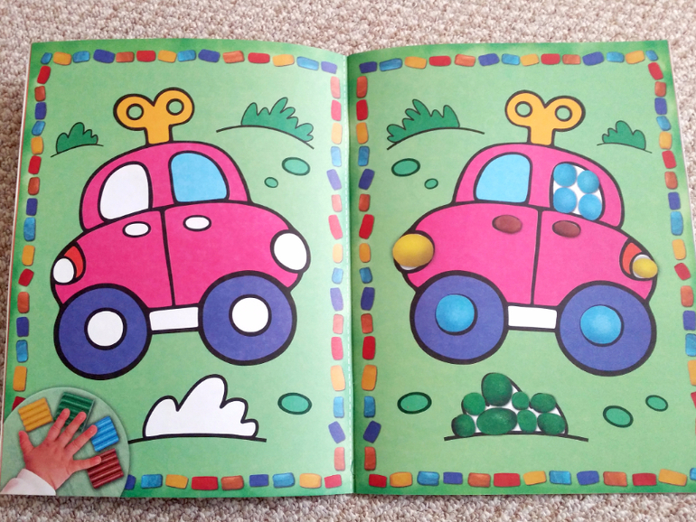Я катаю шарики из пластилина разных цветов и складываю на тарелочку, а Илья уже сам ориентируется по картинке и "раскрашивает" этими шариками ее. Закончили картинку - Илья полюбовался, мама для папы сфотографировала-показала )), Илья снимает пластилин и кладет обратно в тарелку. Пользуемся по-прежнему Play Doh, частично он остается на бумаге, но я катаю 3 секунды пальцем вперед-назад - и все эти катышки прекрасно приклеиваются к основному пластилину, так что страница остается идеально чистой. Затем переходим к новому рисунку. Илья эту книгу сам достает, просит пластилин, запала полепить хватает на 2 картинки, это минут 20 времени. Потом сворачиваем наше творчество :-)