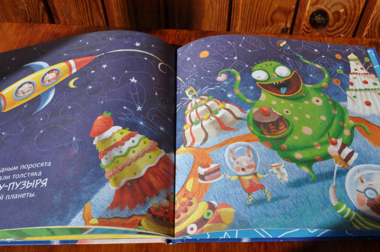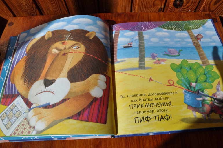 Тосю-Босю мы не читали, а вот братья поросята Витек и Митек стали нам друзьями (ведь их прообразами наверняка являются маленькие ребята, которые тоже любят шалить и проказничать). Текста минимум. Для меня это книжка-картинка. Можем читать ее долго, зависая на каждой странице. По началу, когда сын шел ее читать, брал с собой игрушечный водный пистолетик и помогал поросятам справиться с драконом, львом, пиратами и морковным бароном)) В общем, я не пожалела, что у нас появились "Два поросенка"!