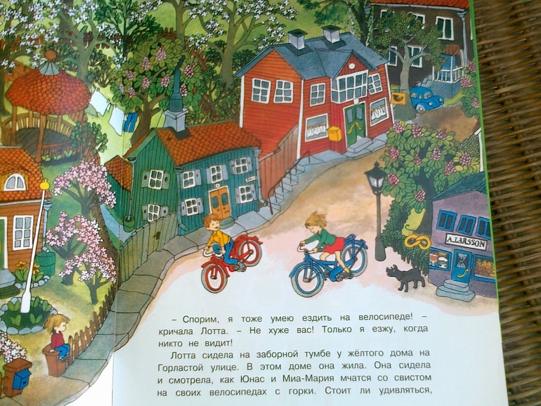 - Вот и я так думаю... Астрид Линдгрен написала, что Юнас и Миа-Мария неслись на велосипедах со свистом. А где тут свист?! Даже маленького ветерка не нарисовано!...(