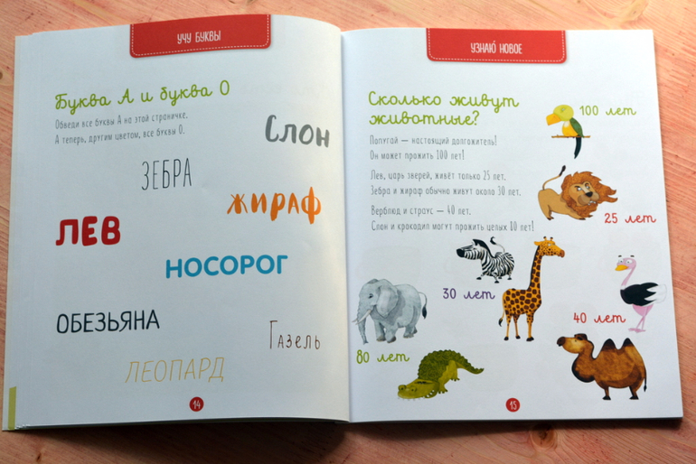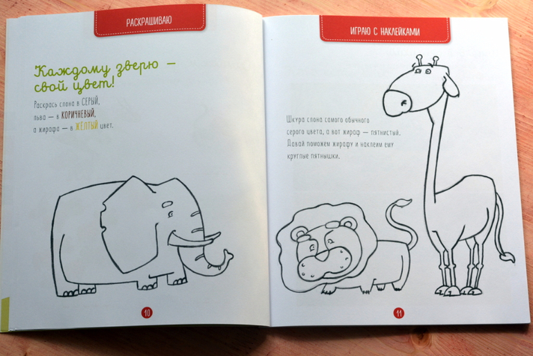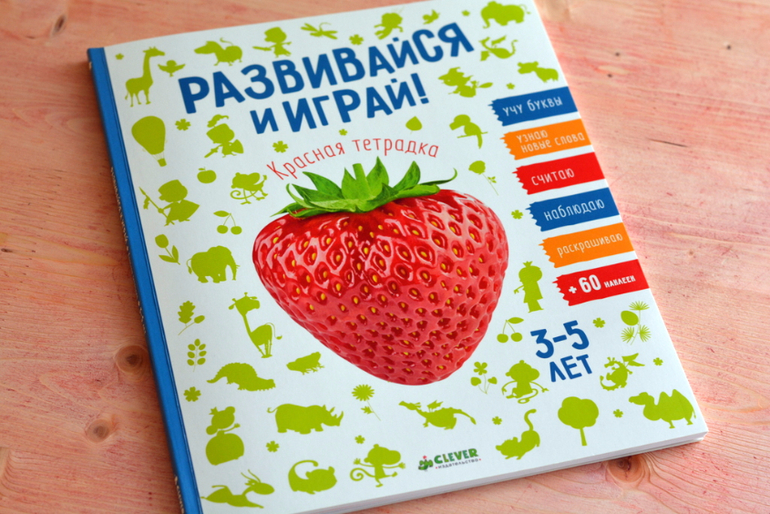 В тетрадке несколько видов заданий - "учу буквы", "узнаю новые слова", "считаю", "наблюдаю", "раскрашиваю" и ещё раздел с заданиями, где нужно использовать наклейки.