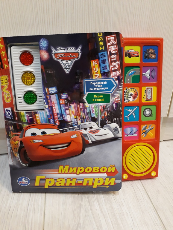 Из плюсов: странички плотные, регулировка громкости есть, машинки двигаются легко, ребенку книга нравится. Из минусов: батареек в светофоре хватило на 10 минут( батарейки в остальных кнопках работают), текст достаточно мелкий ( моему 4-х летке самому читать очень тяжело). Ну и не знаю плюс это или минус:сюжет для увлеченных Маквином.