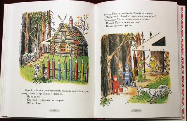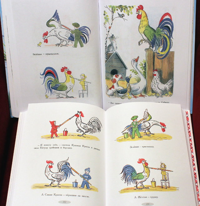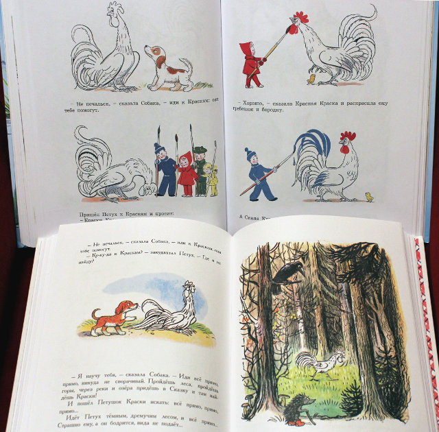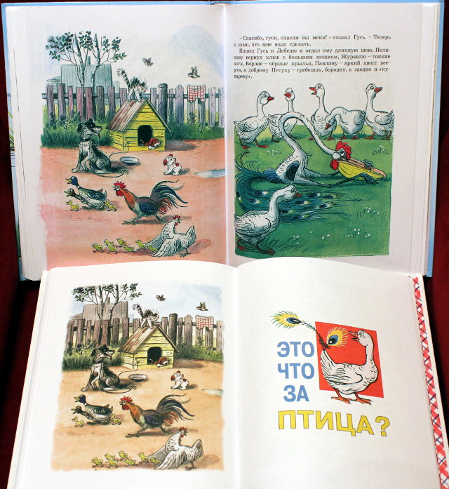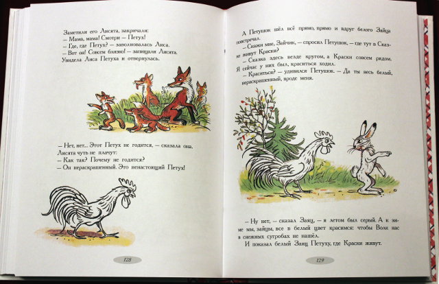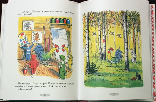 Вот вроде полно Сутеева, а выбрать не из чего. У меня с детства сохранилась книга, но там не все сказки. Нет Мешка яблок, Дяди МИши, Кота-рыболова. Петух и краски в сокращении, но это я только сейчас узнала, что полная версия есть. Купила старшему маленькую книжку, в дополнение, содержание нужное для меня, формат маленький (для меня это плюс), но иллюстрации оказались такими бледными, смотреть невозможно. И заменить не знаю чем. Вот эта по содержанию нравится, но боюсь так же бледная будет... http://www.labirint.ru/books/568143/