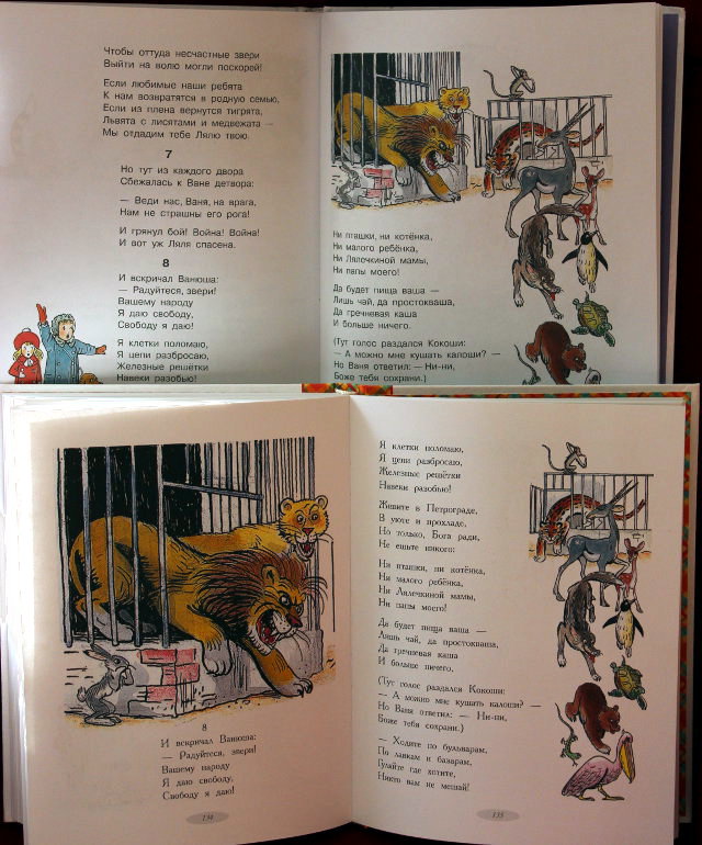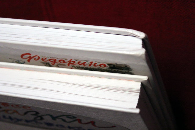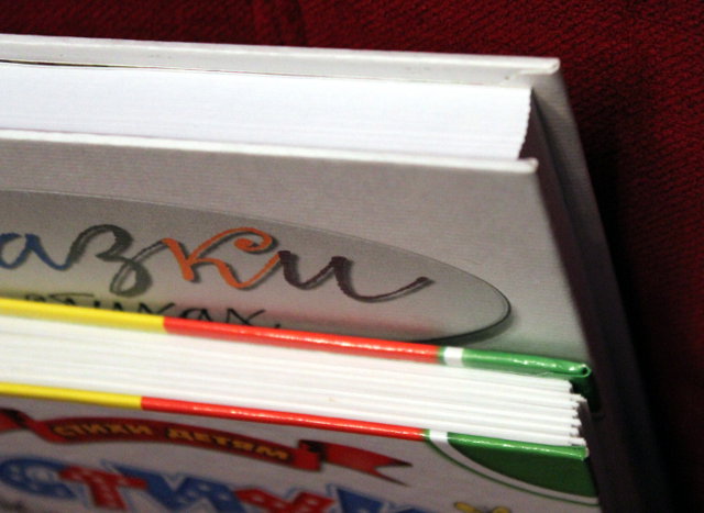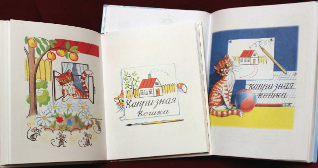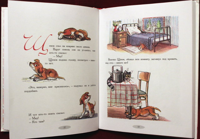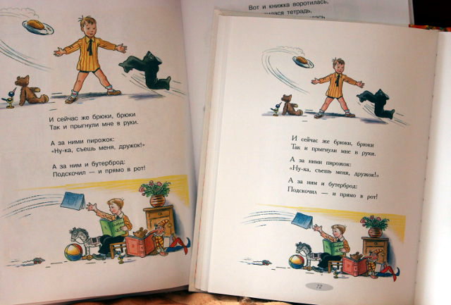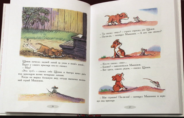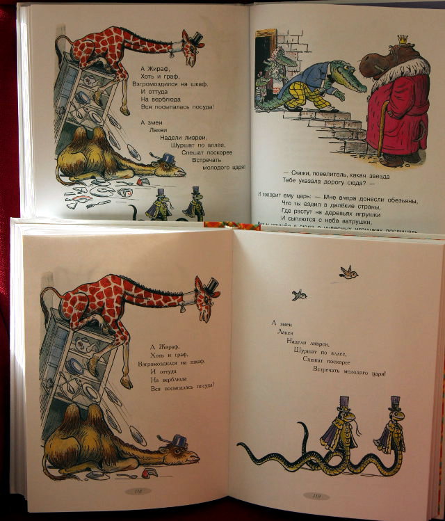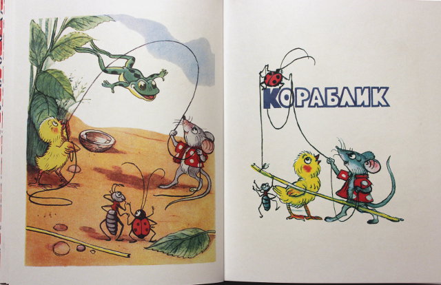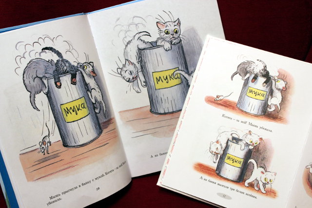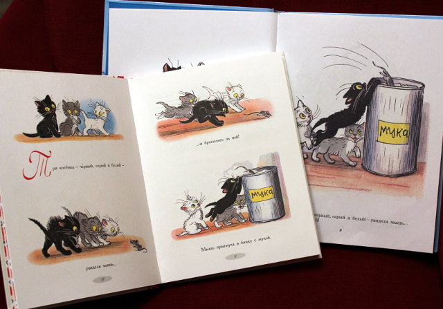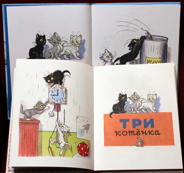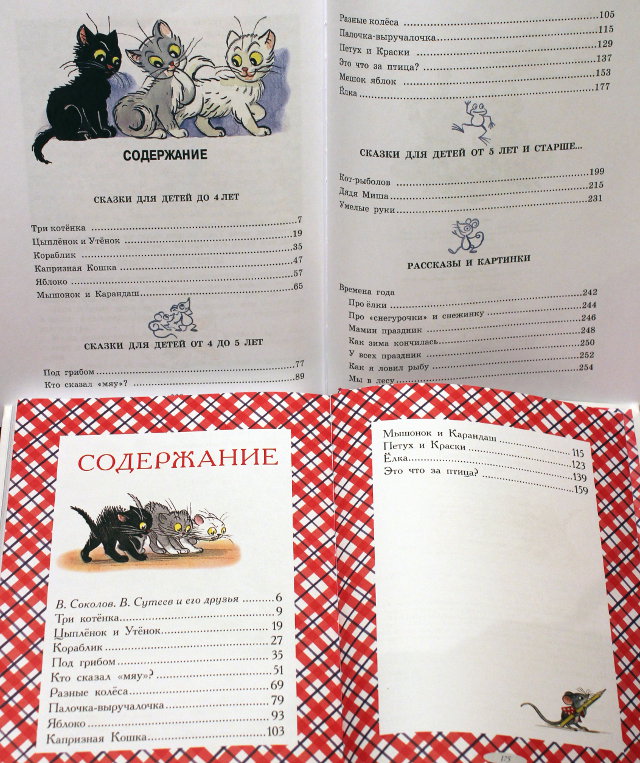 Тут уж увидела, куда деваться) У нас такая "Сказки и картинки" (одна из, серийные не брали). Третье Ваше сравнение. 1. Дизайн удобоваримый, даже милый, но нравится больше серийный. То есть в промежутке между Вашими) 2. Обожка не маркая. 3. Формат удобен, чтобы держать в руке (из-за него и бралась). 4. Листы плотные. 5. Корешок с капталом, крепкая. 6. Обрез неровный, но не критично, на уровне придирок. 7. Картинка с котятами и часами есть, но она как бы вынесена за сказку, в заглавие (но первая сказка про котят, потому не сильно режет глаз). 8. Соотношение картинок на текст как у серийной, некрупные, но много. 9. Есть иллюстрация с лягушкой. 10. Картинка с утопающим есть и на своем месте. 11. Огромных иллюстраций нет, но потому что сама книга невелика))) 12. Иллюстрации слева от названия "Кораблик" нету вовсе. 13. Нет картинки с грибом без зайца (ту, что назвали идентичной). Сразу с зайцем и муравей смотрит на них. 14. Комната в "Кто сказал Мяу" как в серийной. 15. Цвет щенка в некоторых местах весьма посветлел, но нет ощущения, что "светится", но да, разнится(( 16. Такой картинки к разным колесам нету. 17. Заяц и волк, определенно, не бурые. 18. Ворона на елке - нет такой иллюстрации. 19. Нет кошки на окошке((( в какой-то другой нашей была, точно помню, а тут нету. 20. Цвета в "мышонок и карандаш" нормальные, однако нет картинки, которую вы привели в сравнение. Вообще не выделены листы под заголовки, текст начинается сразу под названием. В общем не мешает, но некрасиво. 21. История про Петуха и краски как в серийной, короткая. 22. Дополнительной иллюстрации к елке нету. 23. Иллюстрации с будкой нету, зато есть правая с сидящим на попе гусем и еще одна, когда животные вернули себе свои части тела, а гусь уходит довольный. 24. Мешок яблок есть. Итог: отсутствуют дополнительные картинки, как в серийной, зато нормальные цвета и не маркая. Баш на баш, получается. В целом, я все еще довольна, хотя и могло быть лучше))