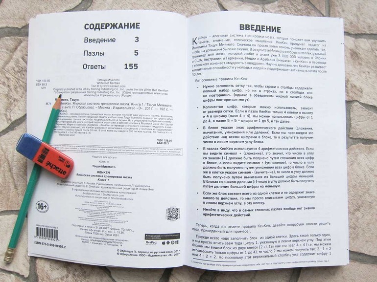 Чем мне очень понравились эти головоломки, так это тем, что в одном квадрате собраны примеры со всеми арифметическими действиями. Нет квадратов только со сложением или вычитанием. Книгу рекомендую всем: и тому, кто млад и тому кто стар) Реальная тренировка мозга. Прямо ощущаешь, как шестеренки в голове прокручиваются сначала со скрипом, а потом все резвее и резвее набирают скорость) Улучшение логического мышления, памяти, внимания - это все тут присутствует. И хотя правила решения просты, сами головоломки (даже самые маленькие по размеру) не так уж и легко решаются. Не за минуту уж точно!) Поэтому ластик всегда под рукой.