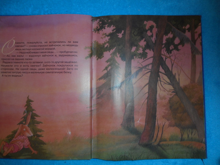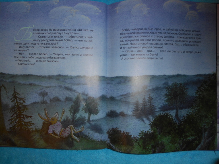 Текст самый обычный, без изюминки. Все-таки автор больше художник. Маленький зайчонок не мог уснуть, а папа предложил посчитать овец. Зайчонок понял все буквально и пошел их искать. По пути он встретил оленя, медведя, белку, лягушку и еще многих зверей, но нигде не находил овечек. Совсем отчаялся, присел отдохнуть и нашел, таки, их.