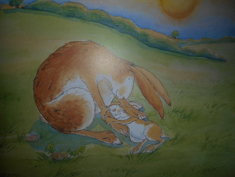 Мама мечется от одного места к другому, но везде зайчонку плохо. И тут, мудрая сова дает маме ценный совет: «Вспомни, куда тебя укладывала спать твоя мама, когда ты сама была маленькой». И оказалось, что зайчонку лучше всего в своей любимой кроватке, а мама всегда будет рядом. Такая милота. А это иллюстрация прямо в точности повторяет меня с дочкой.